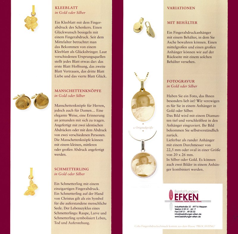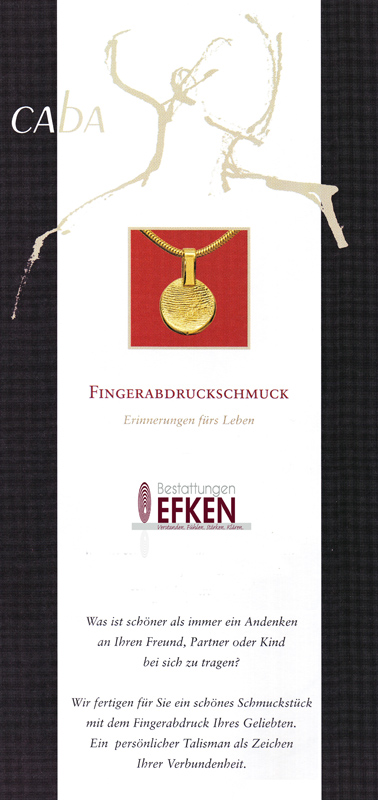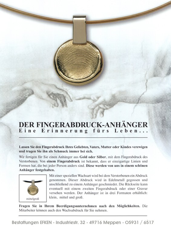 - Fingerprint, Totenmaske, Gravuren und weiterer Erinnerungsschmuck besonderer Art.