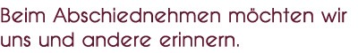 Besondere Erinnerungen können Trauer allmählich in dankbare Freude wandeln, sich gehabt zu haben. Wir können einige - auf den ersten Blick auch ungewöhnliche - Angebote machen, die Ihre Bestattungsfeier zu einem besonders würdevollen Moment werden lassen oder die Erinnerung an den Verstorbenen in besonderer Weise bewahren oder Sie bei der Bewältigung von Trauer unterstützen.